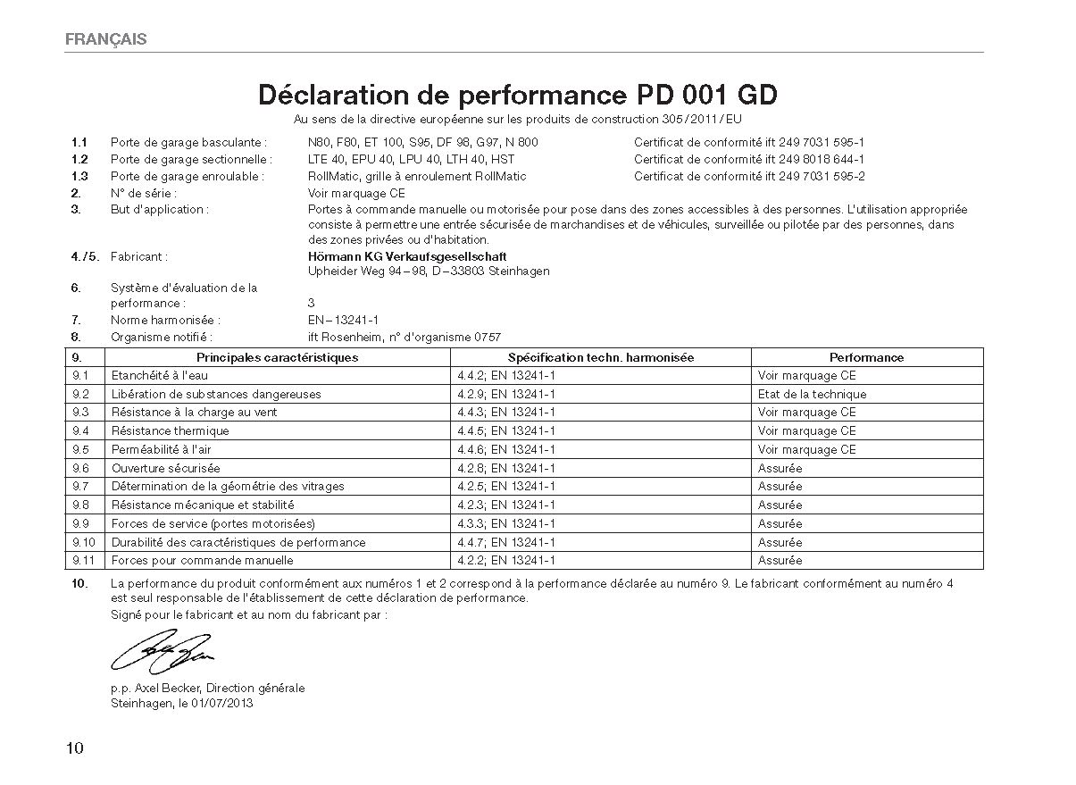 Les valeurs ou classes de performance indiquées ont été déclarées par le fabricant ; elles ont été validées par un essai de type initial, conformément aux normes européennes en vigueur. Si l'une des caractéristiques n'est pas pertinente ou est inconnue, les mentions " non applicable " ou "performance non déclarée" (NPD) sont inscrites, pour cette caractéristique.
